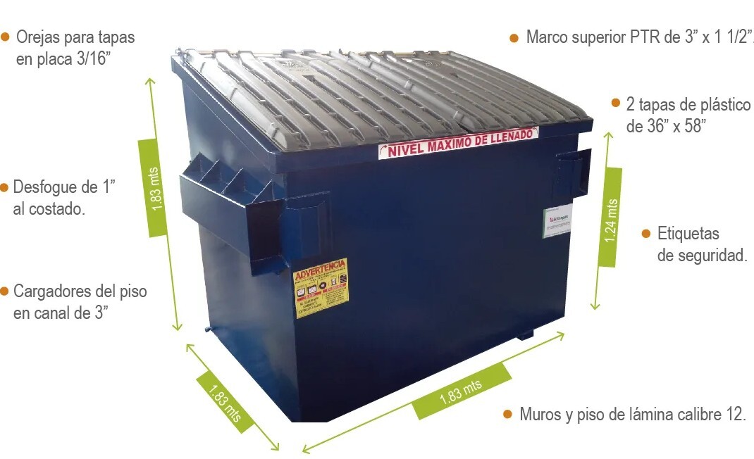 Diseñado para tener una vigorosa y efectiva recolección de restos de basura en ambientes industriales. Este depósito de gran amplitud excelente para emplear extensos tonelajes de basura y desperdicios, avalando resistencia y manejabilidad. Este contenedor de basura tiene una capacidad de 1100 litros, tiene una dimensión de 183 x 93 x 92 cm está fabricado para poder tenerlo en el ámbito industrial. Elaborado con lámina calibre 12 con marcos de PTR de 3 X 1 ½" en sus paredes y piso teniendo una estructura sólida y perdurable, otorgándole un apoyo complementario, asegurándole sostenibilidad en cargamentos de mucho peso sin distorsionarse.