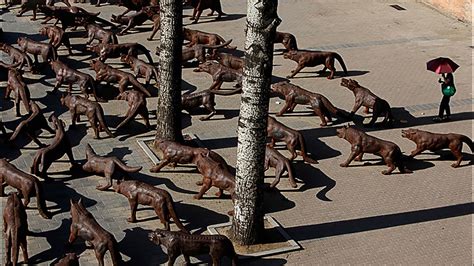 La obra se construye mediante moldes y procesos de fundición en metal que producen superficies densas, duraderas y visualmente poderosas. Cada lobo transmite una postura dinámica y expresiva, como si estuviera en movimiento, lo que crea una tensión visceral con el entorno arquitectónico. Esta técnica de fundición en hierro es similar al proceso tradicional que se emplea en esculturas monumentales para lograr piezas de gran tamaño y peso, capaces de resistir ambientes exteriores sin soporte estructural adicional.