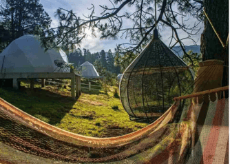 Este proyecto de glamping surge por medio del deseo de “volver a los orígenes” en donde se integra el entorno del bosque, en dicho lugar las cabañas están realizadas con piedra volcánica, también las habitaciones tienen camas, baños privados y ventanales para disfrutar el paisaje del amanecer y anochecer.