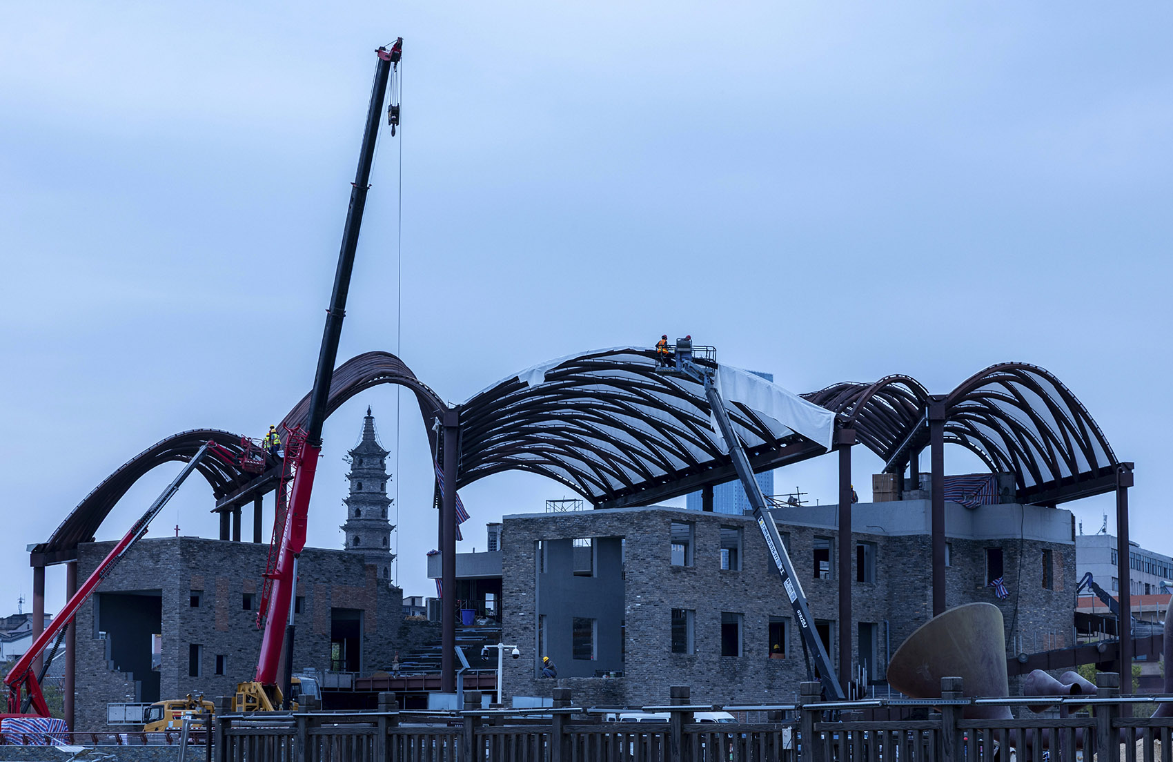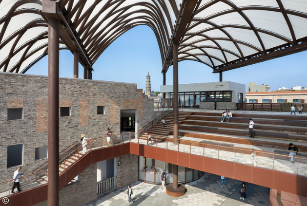 Conservando la era industrial del parque patrimonial del puerto de Yueyang. La estructura de acero desde el cimiento, hasta la estructura que sujeta el toldo. Forman paredes de concreto reforzado, que se inspiran en la cultura contemporánea, realizada en un mirador cercano dentro del parque. Ofrece un fuerte sentido de modernidad, mientras comparte diferentes complejos entre lo viejo y lo nuevo con las paredes de ladrillo desgastadas.