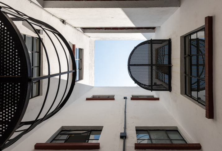 Los interiores sobresalen por sus materiales y texturas, mosaicos de pasta originales, las herrerías de las ventadas, se añadieron escaleras helicoidales en los penthouses y balcones, otro dato importante era la pintura se buscaba que tenga un contraste, tonos blancos y negros de los muros y patios.