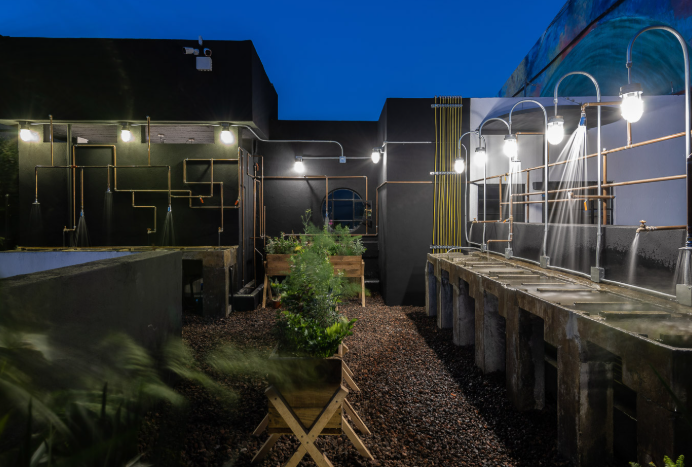 De igual manera cuenta con una fuente que fue diseñado de manera creativa, se creó a partir de los lavaderos originales con tuberías de cobre que funcionan por medio de un sistema de compuertas y manerales desviando el paso del agua. En el centro del jardín se tiene una estructura reticulada de madera que ofrece un jardín comunitario.