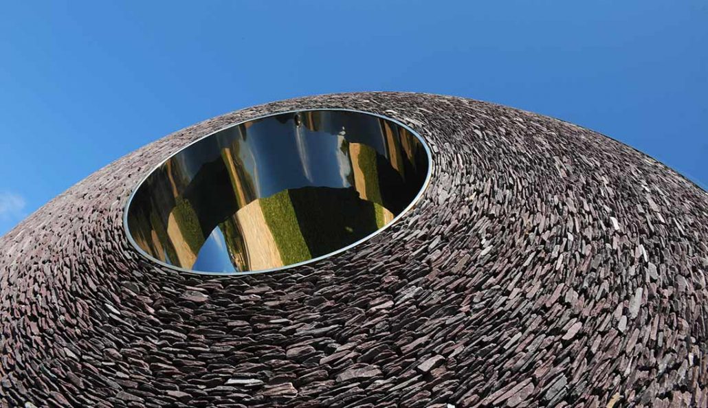 Una de las piezas más intrigantes de David Harber para jardines y espacios públicos es Alveare Wall, una escultura panel que evoca visualmente la repetición de “escamas” metálicas dispuestas en una red caleidoscópica. Esta obra funciona como un panel decorativo y reflector que interactúa con la luz y el entorno, fragmentando y reinterpretando lo que la rodea en patrones de brillo y sombra. La idea de este diseño está inspirada en patrones matemáticos y orgánicos que se encuentran en la naturaleza, como los del interior de un girasol.